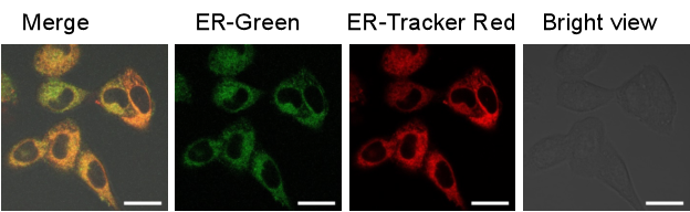 ER-Green是生光生物科技公司通過(guò)對(duì)對(duì)文獻(xiàn)報(bào)道內(nèi)質(zhì)網(wǎng)探針進(jìn)行結(jié)構(gòu)修飾與優(yōu)化,篩選得到的一類高選擇性內(nèi)質(zhì)網(wǎng)定位綠色熒光探針。ER-Green可以用于活細(xì)胞內(nèi)質(zhì)網(wǎng)特異性熒光染色。與商業(yè)化 ER-Tracker Red 等探針相比,ER-Green熒光強(qiáng)度強(qiáng),細(xì)胞毒性低,光穩(wěn)定性強(qiáng)。ER-Green在活細(xì)胞內(nèi)持續(xù)時(shí)間長(zhǎng),可以和其它探針實(shí)現(xiàn)聯(lián)合使用。