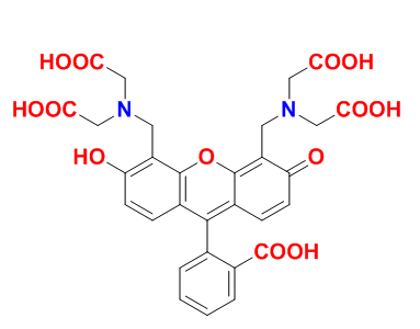鈣黃綠素,也稱為熒光素,熒光素復合物,是一種熒光鈣指示劑,其激發(fā)和發(fā)射波長分別為495和515nm。鈣黃綠素在100 mM以上的濃度下會自動猝滅。它用作EDTA滴定鈣離子和熒光測定鈣的絡(luò)合指示劑,微溶于水。質(zhì)子解離常數(shù)為pKa1的= 2.1,pKa2 = 2.9,pKa3 = 4.2,pKa4 = 5.5,pKa5 = 10.8和pKa6 = 11.7。鈣黃綠素溶液在酸性條件下發(fā)出黃綠色熒光,而在堿性條件下不發(fā)出熒光。但是,鈣黃綠素在堿性條件下在金屬離子(例如Al,Ba,Cu,Mg和Zn)存在下發(fā)出熒光。因此,鈣黃綠素還可以用于除Ca之外的這些重金屬離子的直接熒光滴定。